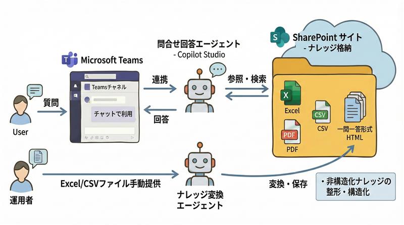 本プロジェクトにおける問い合わせ回答システムの構成は以下の通りです。Teamsを利用した問い合わせフローと、SharePoint上のナレッジ参照構成により、実運用を前提とした設計としました。