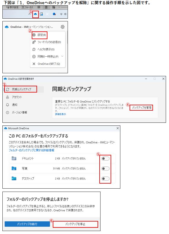 1.4「ドキュメント」「写真」「デスクトップ」のスイッチをOFFにして、OneDriveとの同期を無効にします。無効化する際に「バックアップを停止」をクリックしてください。