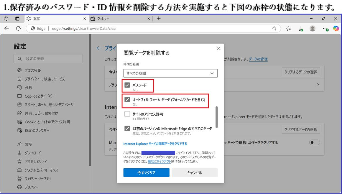 - ⑤以下にチェックを入れた状態で「今すぐクリア」をクリック。